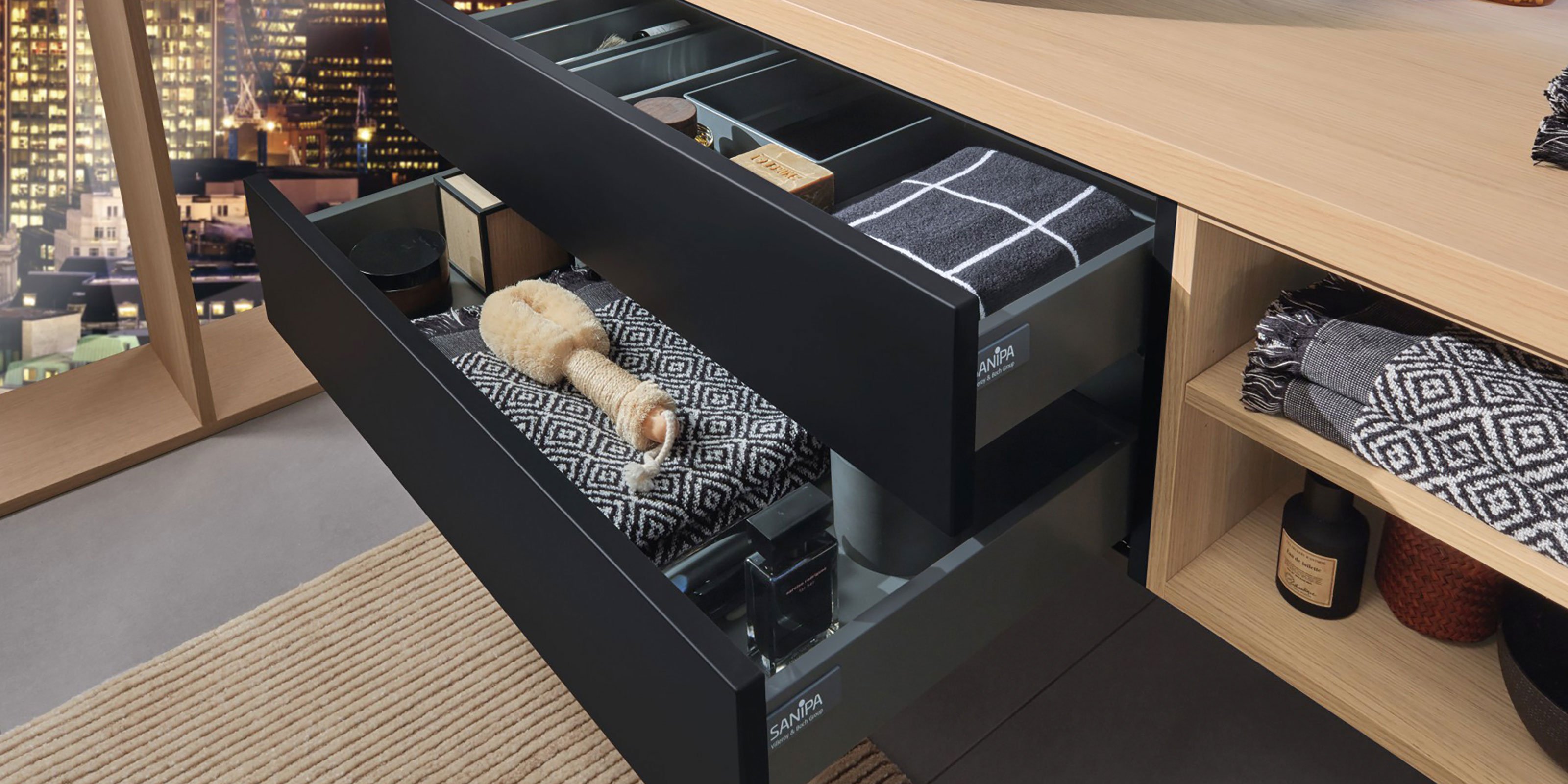 Der symmetrische Doppelwaschplatz mit vier Auszügen und offenem, breitenvariablen Regal bietet spielend Platz für zwei. Seine pflegeleichte, schwarz matte Oberfläche mit Anti-Fingerprint-Effekt steht in gekonntem Kontrast zum hellen Holzton der 2morrow Platte Slim. Einen edlen Touch verleihen die Griffe in Gold Matt mit dazu passenden Wandarmaturen. Die beiden auffälligen, runden Reflection Lichtspiegel LOLA sorgen für stimmungsvolles Licht, das per Raumschaltung bedient wird.