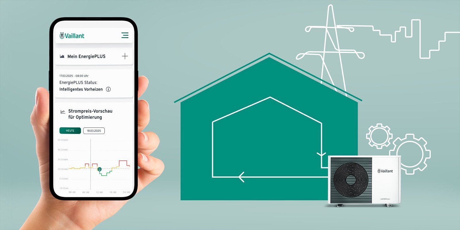 Mit dem Energiemanagement-Service von Vaillant Wärmepumpen und Photovoltaikanlagen intelligent steuern: automatisch Kosten sparen, Komfort erhalten und klimafreundlich heizen. Jetzt mehr über die Vorteile erfahren!
